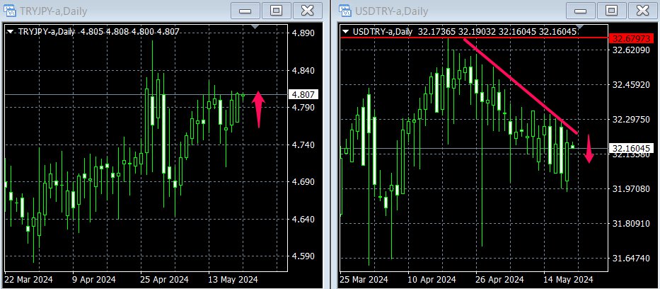 ドルトルコの上値切り下げトレンドは継続されており32.1台まで切り下げています。